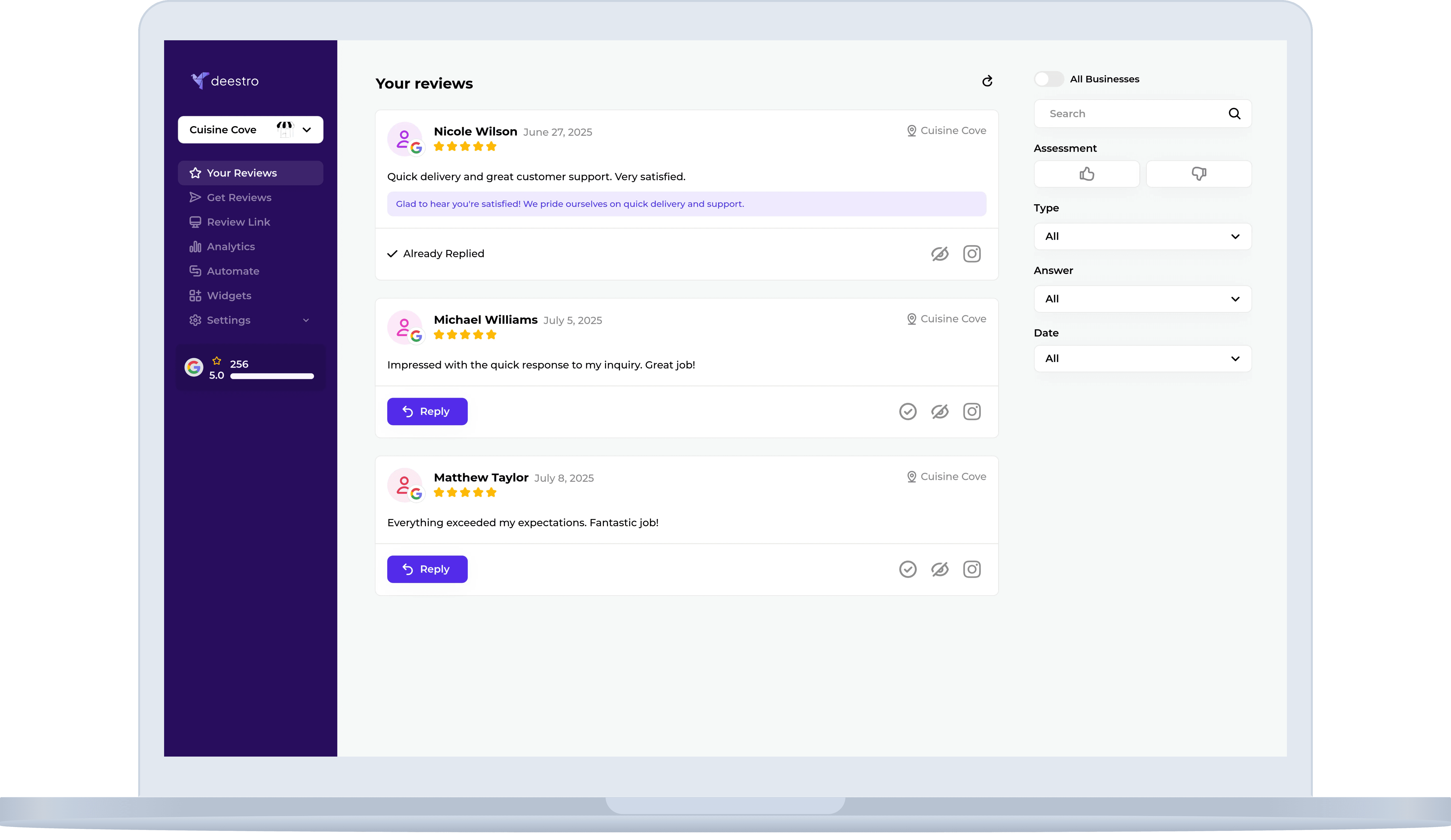 Use our platform to send review requests, monitor results, and grow your reputation at your own pace.